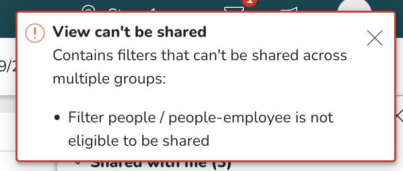 Filters die op klantniveau zijn geconfigureerd, zoals personeelscategorie, overeenkomingssjabloon, vaardigheden, dienststatus, dienstwaarschuwingen, kloktype, afwezigheidstype en andere, worden volledig ondersteund en kunnen zonder enige beperking in gedeelde weergaven worden opgenomen. Om de weergave te delen, verwijdert u de filters die in het bericht worden vermeld en probeert u het opnieuw.