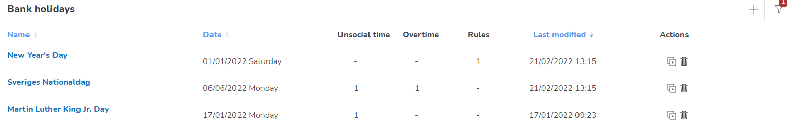 Kolommen zijn sorteervolgorde en u kunt een snel overzicht krijgen van wanneer een feestdag voor het laatst is bijgewerkt en het aantal onregelmatige werktijden, overuren en dag regels die ermee zijn geassocieerd.