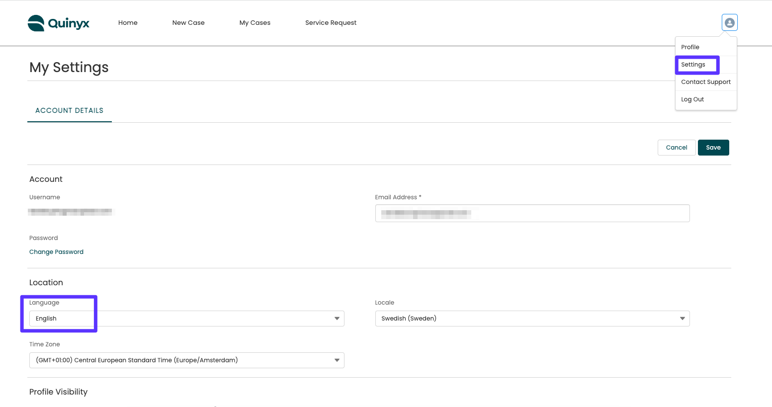 Detta kan vanligtvis lösas genom att logga ut och logga in igen. Du kan också prova en annan webbläsare. Om problemet kvarstår, se till att språkvalet är inställt på engelska i Supportportalen > Mina inställningar > Språk: