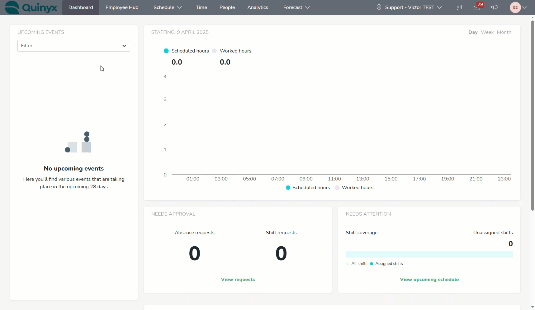 Tänk på att Quinyx gör detta "byte" endast varje hel timme. Om stämplingen sker klockan 20:16 kommer de förväntade timmarna att återspegla det skiftets skifttimmar tills klockan slår 21:00. När klockan har slagit 21:00 kommer de förväntade timmarna istället att återspegla det skiftets stämplingstimmar.