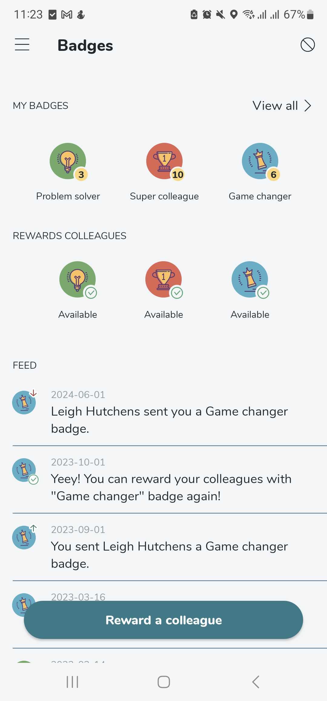 - En kollega kan få samma märke från flera olika kollegor - om detta händer, kommer det att markeras i märkesmodulen som "Problem lösare x3" för att indikera att denna person har fått detta märke tre gånger. Du kommer också att se att kollegor har fått märken genom en ikon i profilbilden i hela appen.