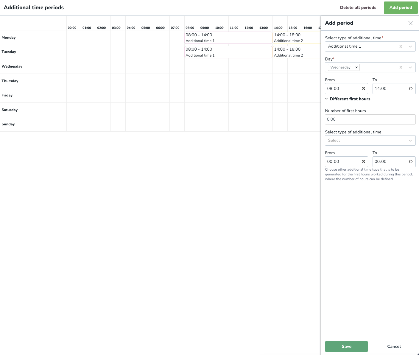 Avancerade mertidsperioder ställs in på organisationsnivå för att automatiskt tilldela extra ersättning till en deltidsanställd som loggar ett skift under ett visst tidsfönster. Dessa globala inställningar används sedan som standard i avtalsmallar och individuella avtal.