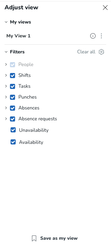 Filter | Den här sektionen innehåller det vi kallar Filtergrupperingar. Du kan tänka på en filtergruppering på samma sätt som en typ av schemaobjekt, dvs. ett objekt som finns i det faktiska schemat. Filtergrupperingarna är följande: Personer, Skift, Uppgifter, Stämplingar, Frånvaro, Frånvaroänsoken, Inte tillgänglig, Tillgänglighet. Varje filtergruppering har ett antal alternativ (fält) under sig, så att användaren kan välja ett eller flera fält/värden att filtrera på samtidigt. Varje filtergruppering kan fällas ihop och expanderas, vilket gör det lättare att navigera i filterpanelen utan att behöva använda scrollfältet. Alla filtergrupperingar är expanderade som standard. |
