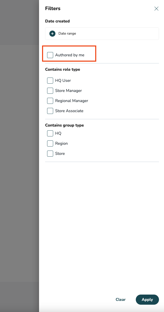 - I filtervyn markerar du checkrutan Skapad av mig och klickar på Tillämpa för att se dina egna sparade målgruppslistor.
