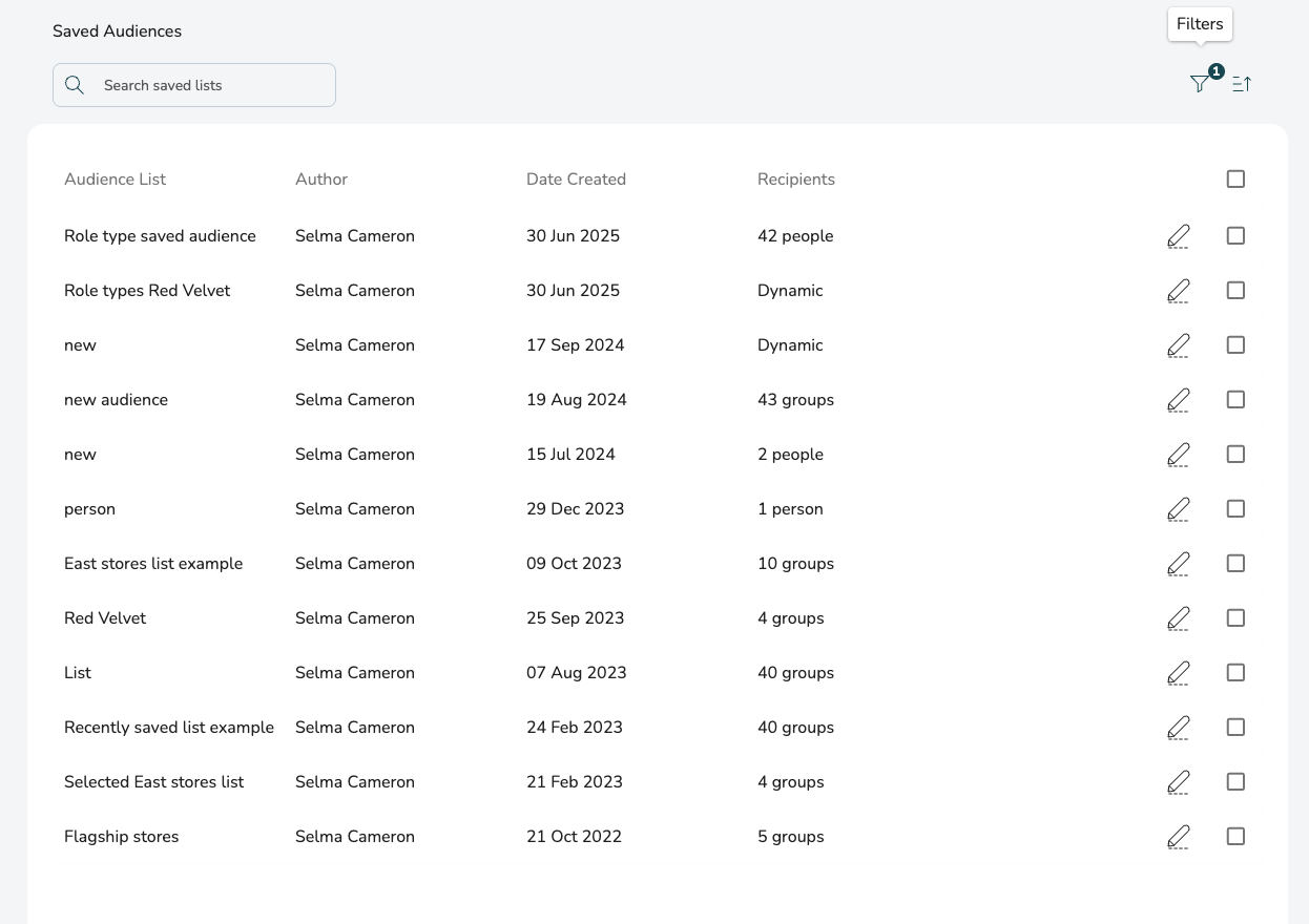 - Du kommer nu bara att se sparade målgruppslistor som du har skapat.