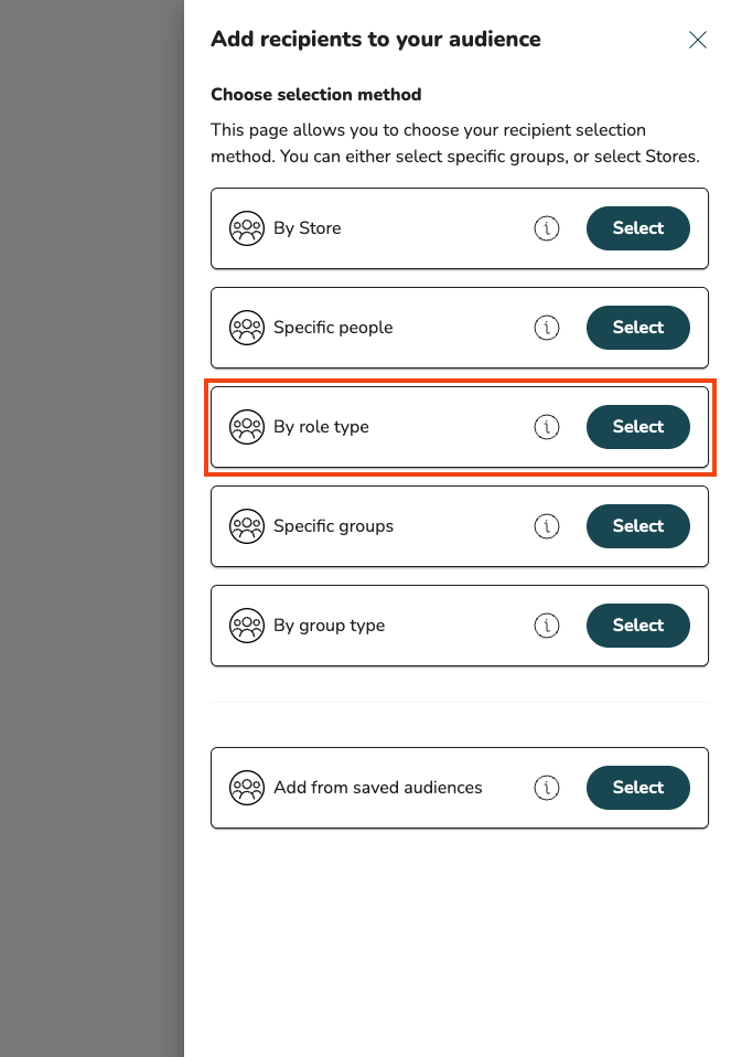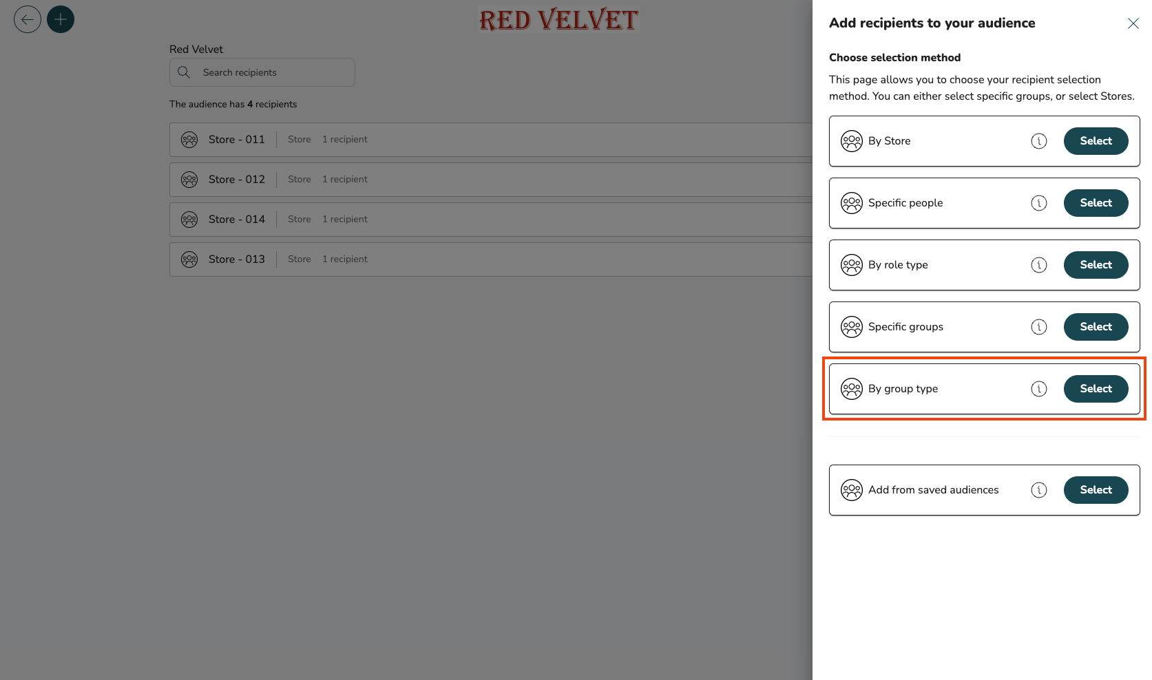 En sidopanel visas där du kan välja mottagarvalsmetoder. Därefter kan du välja vilken mottagare du vill lägga till i den sparade målgruppen och bekräfta ändringen genom att välja knappen Bekräfta längst ner till höger.