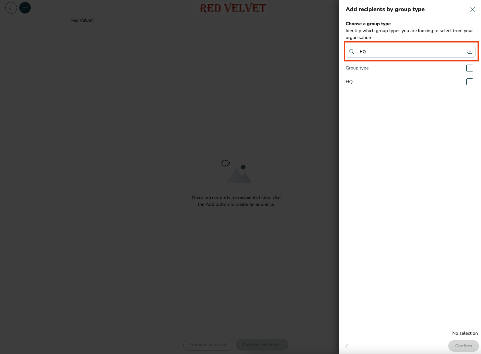 - Genom att använda sökfältet i grupptypsväljaren kan du söka efter specifika nyckelord för att begränsa listan över tillgängliga grupptyper som dina mottagare.