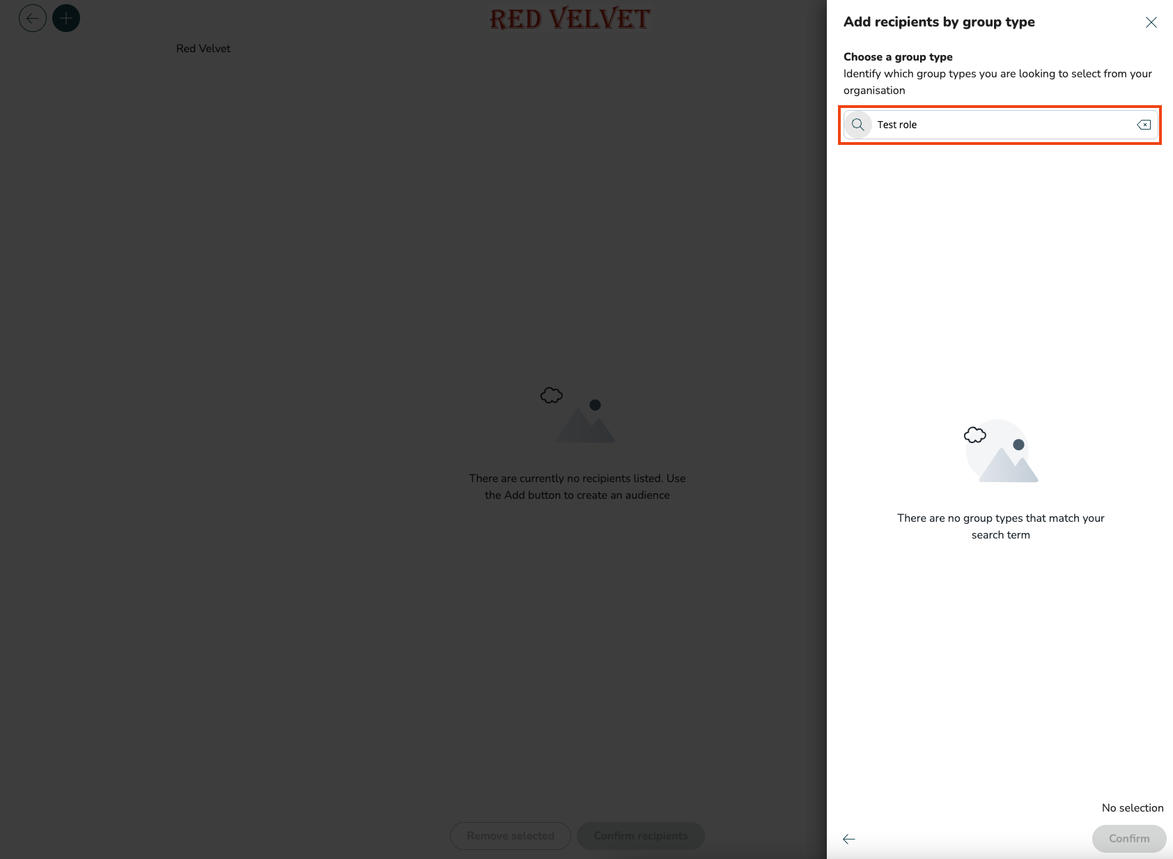 - Genom att använda sökfältet i roll typ väljaren kan du söka efter specifika nyckelord för att begränsa listan över tillgängliga roll typer som dina mottagare.