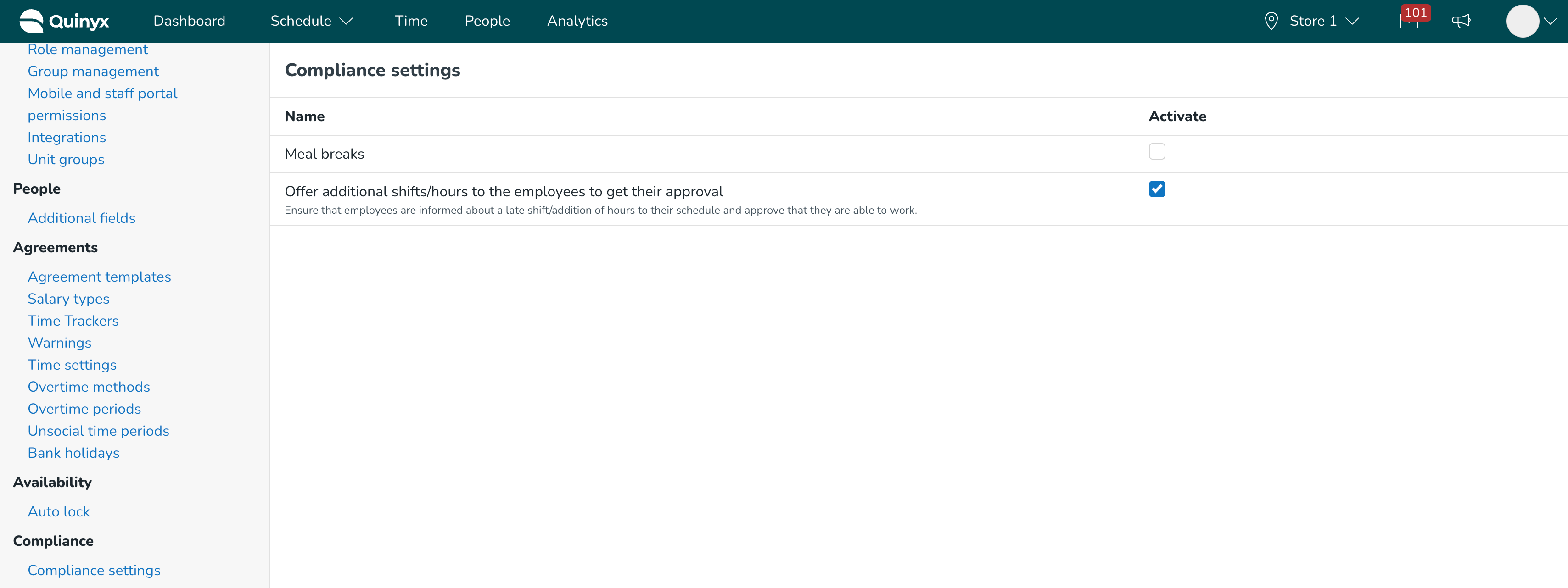 För att använda denna funktionalitet måste du aktivera den på sidan Kontoinställningar > Efterlevnadsinställningar. Efter att kryssrutan har markerats kommer denna funktionalitet att vara synlig för chefer i Schemavyn och för anställda i mobilapplikationen.