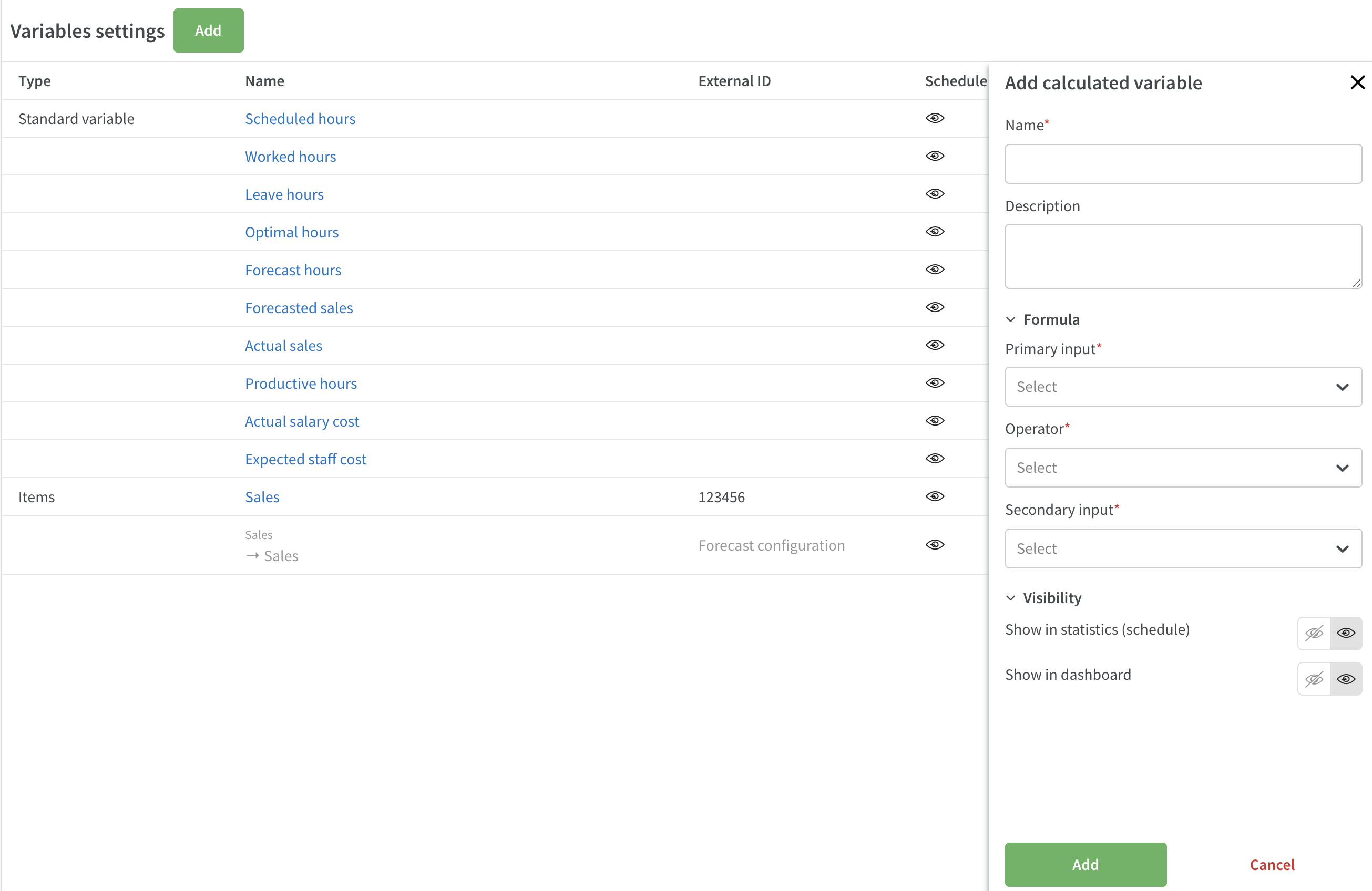 När någon ny beräknad variabel läggs till, kommer synligheten att ställas in på JA för både schema och översikten som standard. Du kan ändra detta närsomhelst, däremot kommer alla variabler som inkluderar ingångsdatatyp som faktisk lönekostnad, förväntad lönekostnad att döljas från översikten.